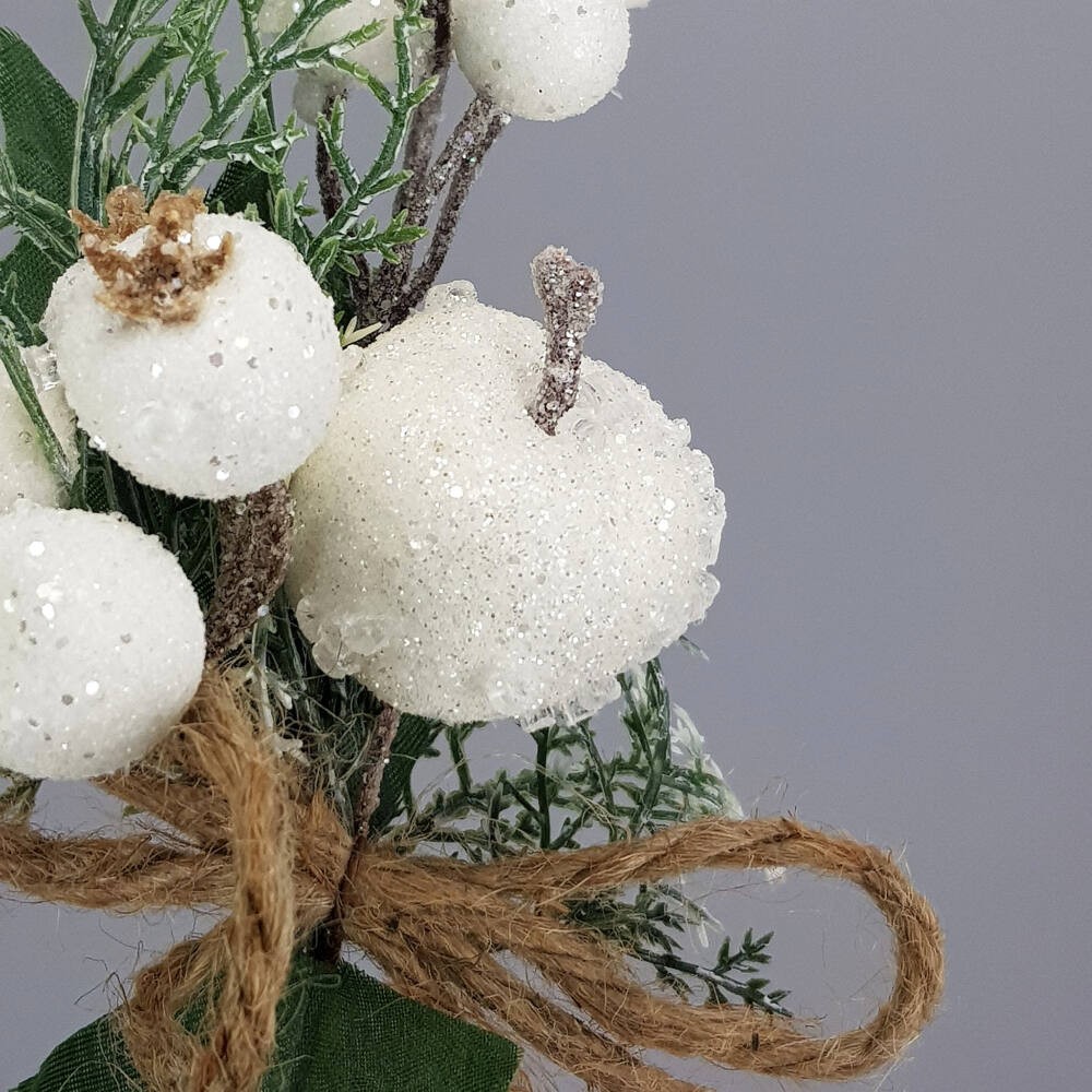 Téli pick, faág dekoráció, fehér (csillogós) bogyókkal és almával, zöldes-fehér (havas) levelekkel.Koszorú díszítéshez és egyedi csokor készítmény, illetve asztali dekoráció készítéséhez.